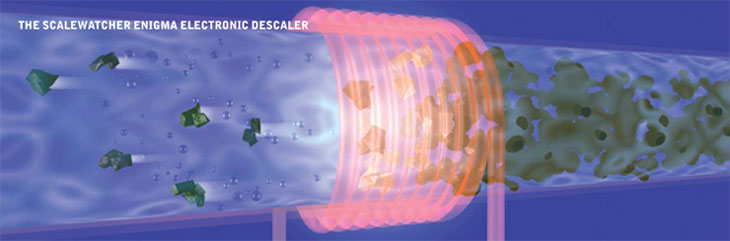 Using modern microprocessors and signal processing techniques, the Scalewatcher Enigma produces a complex, modulating frequency waveform (which in terms of magnetic strength is insignificant). When this is applied to the water, the energy induced in the water is sufficient to cause the premature precipitation of the calcium. Because precipitation occurs in the bulk of the water, the crystals seed onto other naturally occurring ions in the water, such as zinc, copper, iron etc. Their size and shape bear no physical resemblance to those formed in untreated water and they remain in suspension until discharged to drain.