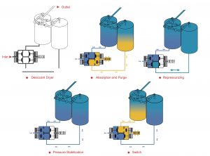 Moisture is adsorbed by the desiccant as the air flows through the chamber. Adsorption is an exothermic (heat releasing) process, and as it progresses through the chamber, heat of adsorption is released. This heat later contributes to regeneration. Dry compressed air exits at the outlet valve, and then through an After Filter, where any desiccant dust being carried by the air will be removed. The clean and dry air then