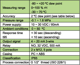 The measured dew point is output via a 4-20 mA signal output. The integrated display shows online measurement value and alarm status. One alarm can be programmed which will activate a relay.