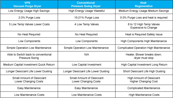 The VAPS VPS Vacuum Purge Heatless Pressure Swing Dryer for Compressed Air Dryer offers the lowest capital cost and lower long term operating costs compared to conventional heatless dryer and heat regenerative dryer. The VPS Vacuum Purge dryers offer the highest reliability solutions for low dew point compressed air.