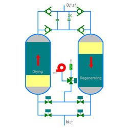 Moisture is adsorbed by the desiccant as the air flows through the chamber. Adsorption is an exothermic (heat releasing) process, and as it progresses through the chamber, heat of adsorption is released. This heat later contributes to regeneration. Dry compressed air exits at the outlet valve, and then through an After Filter, where any desiccant dust being carried by the air will be removed. The clean and dry air then